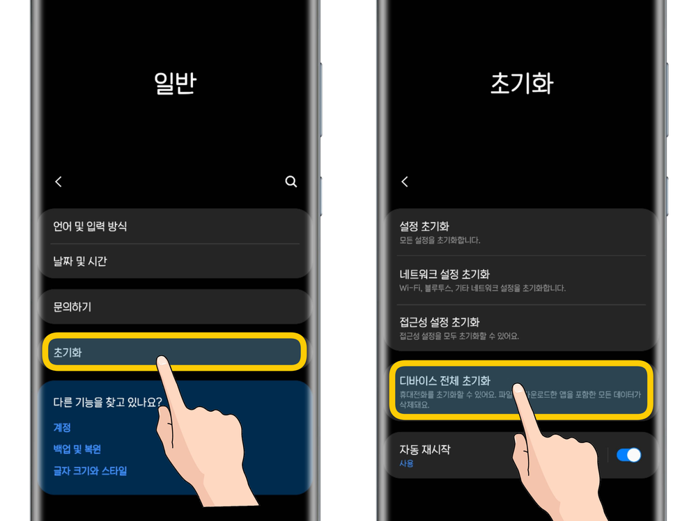 가장 기본적이고 쉬운 초기화 방법은 스마트폰의 설정 메뉴를 이용하는 것입니다.