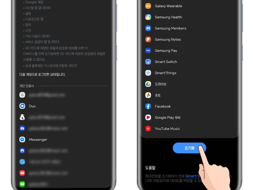 - 삼성 계정도 마찬가지로 로그아웃해야 초기화 후 인증 절차를 줄일 수 있습니다.